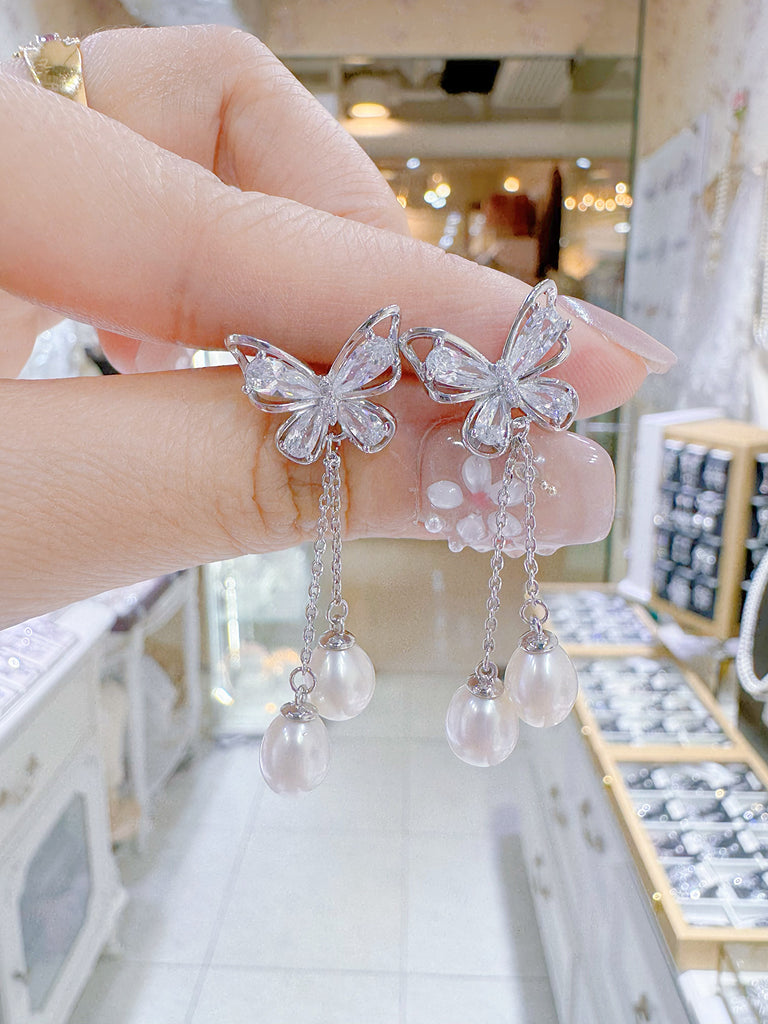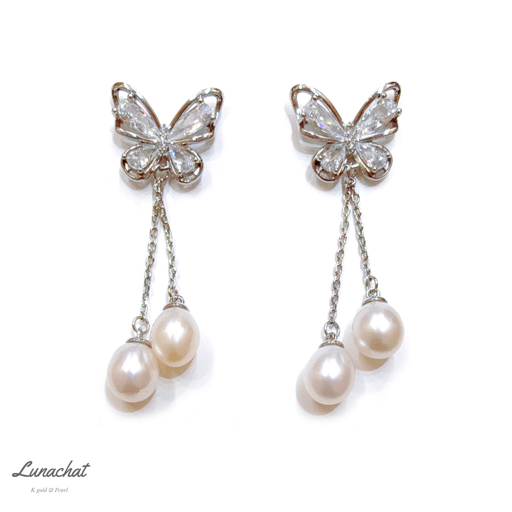 Lunachat 925純銀 5-6/ 9-10mm 淡水珍珠蝴蝶結長耳環