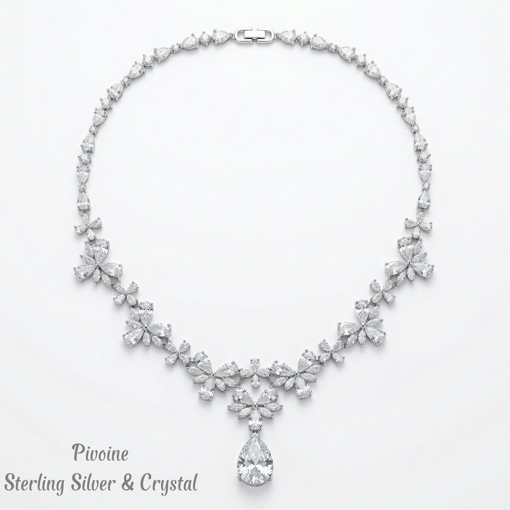 Celebrate your most cherished moments with the Pivoine Milano Sterling Silver and Crystal Bridal Necklace—a masterpiece designed to enhance your wedding day. Each piece is meticulously crafted from premium Sterling Silver and adorned with brilliant crystals that catch the light beautifully. Whether you're walking down the aisle or attending a formal celebration, this necklace brings timeless sophistication and a subtle sparkle that complements any bridal ensemble perfectly.
