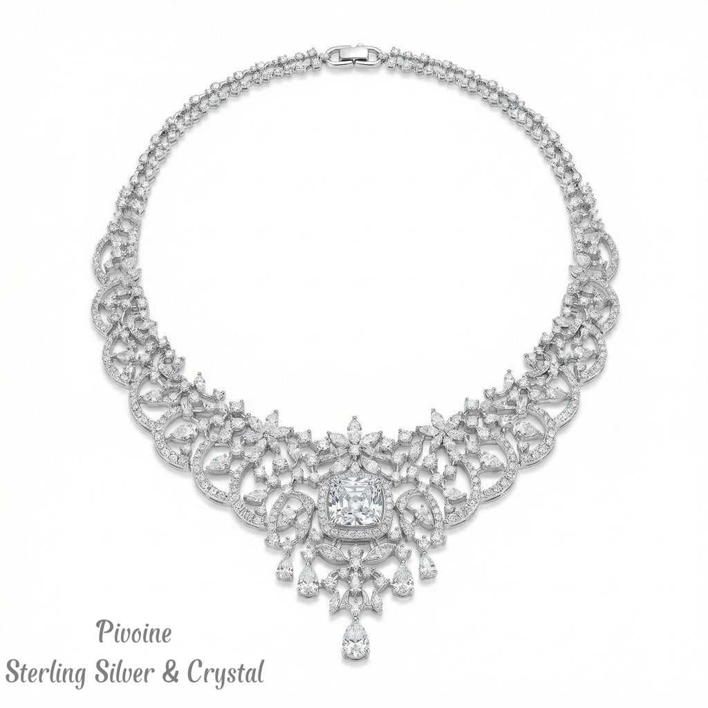 Indulge in the opulent beauty of the Pivoine Milano Sterling Silver and Crystal Bridal Necklace, a stunning piece to elevate your special day. Handcrafted from exquisite Sterling Silver with dazzling crystal adornments, this necklace exudes elegance and radiates with a touch of glamour, making it an ideal choice for weddings, special events, and formal affairs.